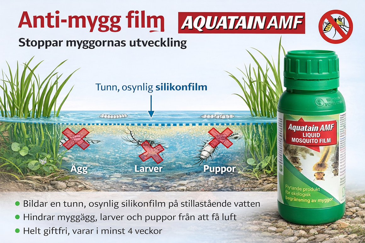 Slipp myggproblem redan innan de börjar. Aquatain AMF är en effektiv och miljövänlig lösning som hindrar mygg från att utvecklas i stillastående vatten. Istället för att bekämpa vuxna mygg bryter Aquatain livscykeln direkt i vattnet – där problemen börjar.